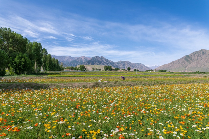 時(shí)值盛夏,地處祁連山北麓高海拔山區(qū)的甘肅省高臺(tái)縣新壩鎮(zhèn)紅沙河村種植的虞美人繽紛綻放,形成花海景觀。近年來(lái),高臺(tái)縣新壩鎮(zhèn)將花卉蔬菜制種作為特色產(chǎn)業(yè)來(lái)抓,積極引導(dǎo)農(nóng)戶(hù)規(guī)?;?、集中化種植,成為當(dāng)?shù)剞r(nóng)業(yè)增效、農(nóng)民增收的支柱產(chǎn)業(yè)之一。